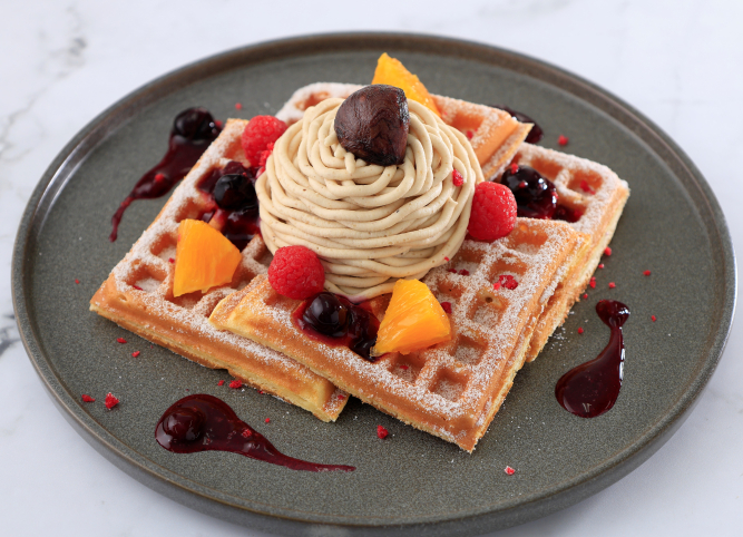 栗と果実のモンブランワッフル 単品1,080円 ミックスベリーソースとオレンジの酸味、モンブランクリームの甘味が調和した一品となっております。
